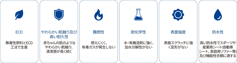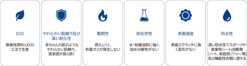 ソフトな感触と優れた耐久力、防水性を持ち、自動車シートや内装材、